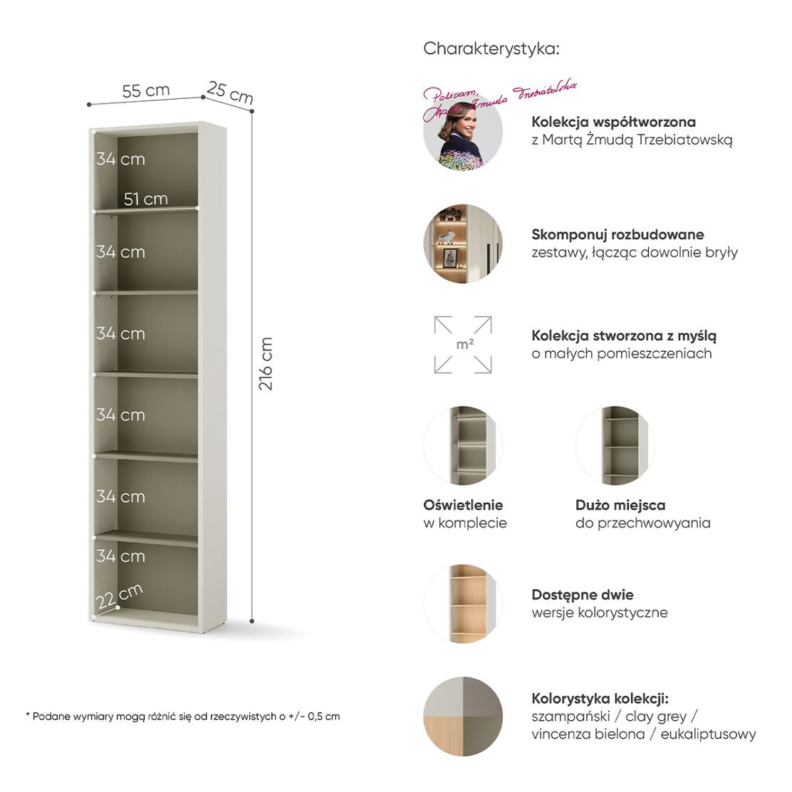 Тази елегантна отворена етажерка от серия WOOW преобразява всяко пространство. Изработена от висококачествено ПДЧ в изисканата комбинация шампанско и евкалипт, тя внася модерен шик и усещане за простор във Вашия интериор.